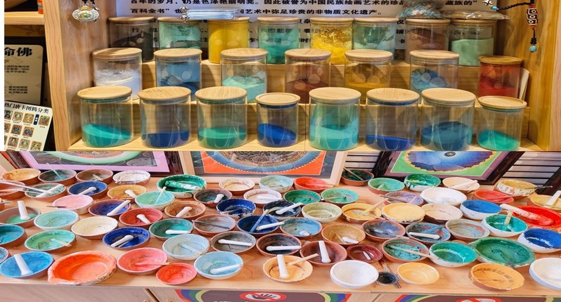 唐卡是用明亮的色彩描绘,颜料传统上是全部采用金、银、珍珠、玛瑙、珊瑚、松石、孔雀石、朱砂等珍贵的矿物宝石和藏红花、大黄、蓝靛等植物为颜料。这些天然原料保证了所绘制的唐卡色泽鲜艳,璀璨夺目,虽经几百年的岁月,仍是色泽艳丽明亮。